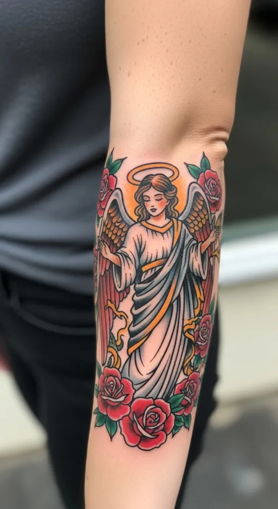 This vibrant forearm piece showcases a classic American traditional style with a modern, feminine twist. The tattoo features a serene guardian angel draped in flowing white robes with soft blue shadows, framed by a halo of glowing gold. Her wings are incredibly detailed, blending warm, earthy tones with pops of red that match the lush roses surrounding her. The bold black outlines and rich color palette of deep reds, forest greens, and golden yellows give the design a timeless feel, while the placement perfectly contours the natural shape of the arm.
