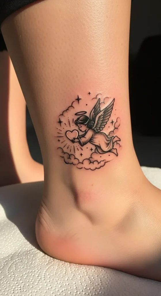 This sweet ankle tattoo features a classic cherub floating among soft clouds and twinkling stars. The design uses clean black linework with subtle gray shading to give the angel a gentle sense of movement. It is a small to medium sized piece that perfectly fits the curve of the lower leg. The focal point is a glowing heart held out by the angel which serves as a beautiful symbol of keeping a loved one’s memory close to you. Everything is done in a timeless black and gray palette that keeps the look elegant and understated.