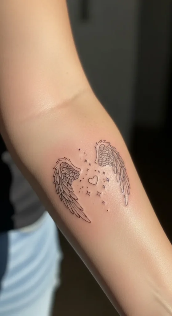 This fine-line piece on the inner forearm features two gracefully arched angel wings framing a central heart. The ink work is delicate and precise, using varying shades of black and grey to create texture in the feathers without looking heavy. Surrounding the heart is a cluster of tiny four-pointed stars and dots that give the whole design a shimmering effect. It is a small- to medium-sized tattoo that relies on negative space to keep it feeling light and airy on the skin.