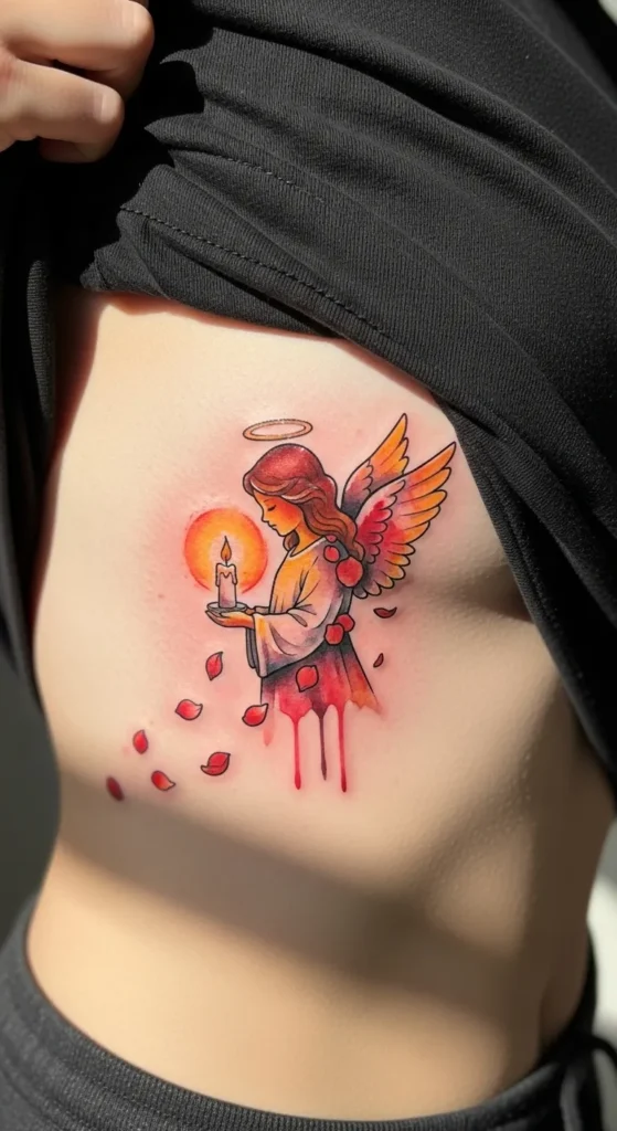 This vibrant piece sits beautifully on the ribs and captures a serene angel cradling a glowing candle. The design uses a warm color palette of fiery oranges, deep reds, and soft yellows to create a luminous effect that radiates from the flame. It is a medium-sized tattoo featuring delicate black outlines that give it a clean yet artistic look. The bottom of the angel blends into a unique dripping paint effect while deep red petals drift away into the space around her. The halo and the soft glow around the candle add a touch of peace to the entire composition.