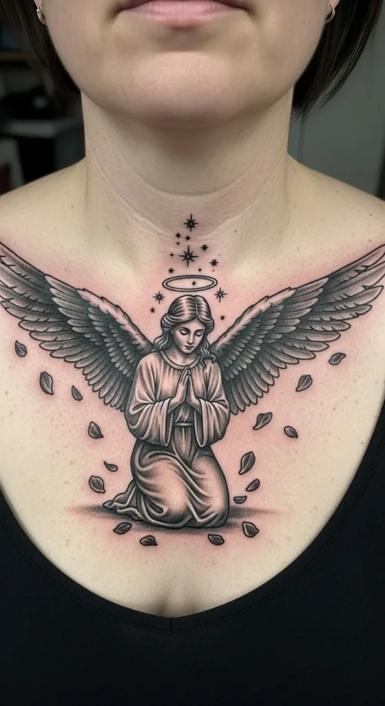 This stunning black and grey chest piece features a kneeling angel in a prayerful pose centered right below the collarbone. The wingspan stretches beautifully across the upper chest with meticulous shading that gives the feathers a realistic depth. Above her head rests a minimalist halo surrounded by a trail of delicate four-pointed stars that travel up toward the neck. Falling petals or leaves drift around her base, which adds a sense of graceful movement to the whole composition. The use of soft gradients and fine lines creates a timeless look that feels substantial without being overly heavy.