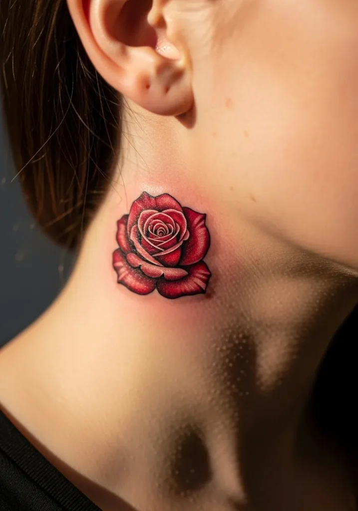 This design shows a realistic red rose tattoo placed elegantly on the side of the neck. The petals are shaded with deep crimson tones that transition beautifully into soft pink highlights, giving the flower a lifelike depth. The contrast between the inky black outline and the subtle redness around the fresh tattoo makes it look almost three-dimensional. It’s a small to medium piece, but it carries a bold, romantic presence that instantly draws the eye.