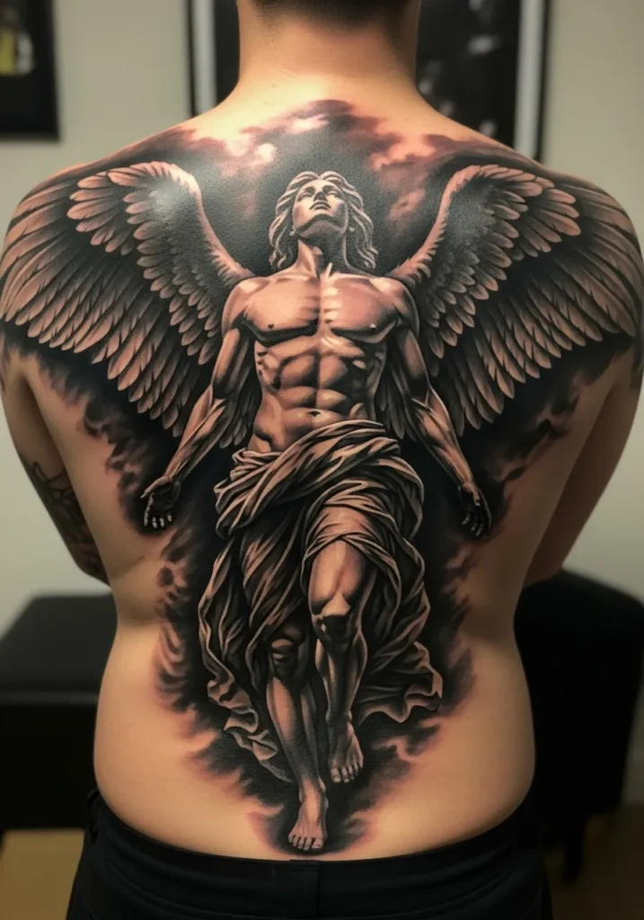 This full-back tattoo is pure artistry. It features a powerful archangel with detailed wings spreading across the shoulders, rendered in dramatic grayscale shading. The play of light and shadow gives the figure a heavenly glow, while the fine folds of fabric add stunning texture and realism.
