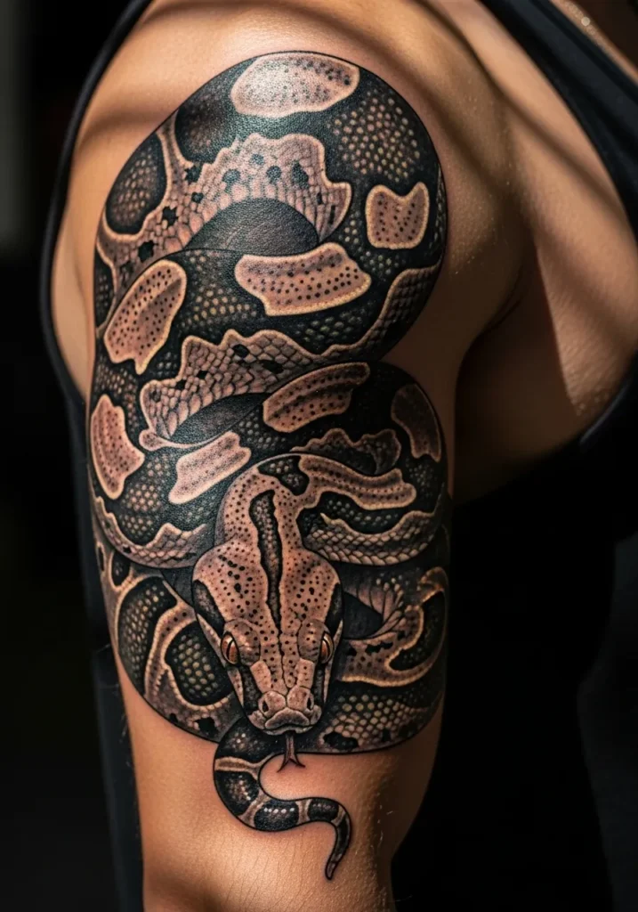 This shoulder tattoo depicts a coiled snake in an ultra-realistic style that looks almost three-dimensional. Every scale is shaded with precision, blending earthy browns and blacks to mimic natural reptile texture. The snake’s body wraps perfectly around the shoulder and upper arm, creating movement and tension in the design.