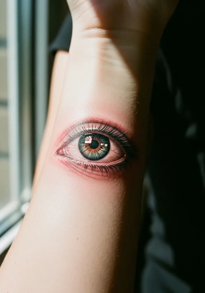 This wrist tattoo captures a single hyper-realistic green eye surrounded by soft pink shading. Every detail is stunning—the tiny veins, delicate lashes, and reflection of light make it look like an actual eye staring back. It’s small yet incredibly impactful.