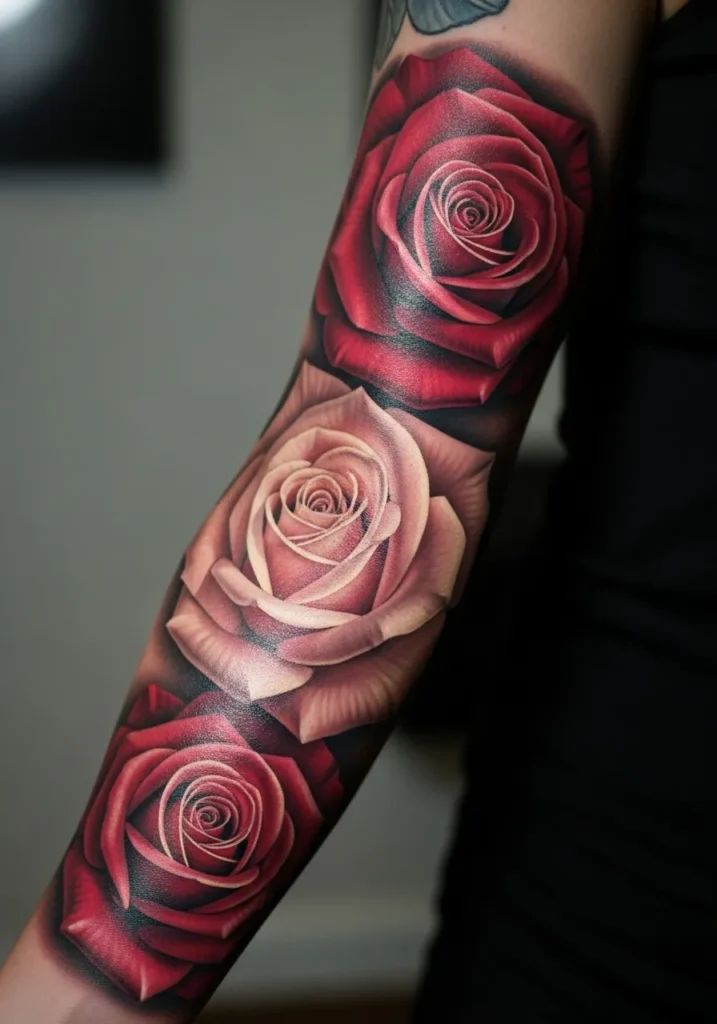 This sleeve tattoo features a trio of incredibly realistic roses, each with lush petals in red and blush tones. The soft gradients, rich shadows, and velvety texture make the flowers look like they’re blooming right from the skin. The placement along the forearm creates a seamless flow of color and form.
