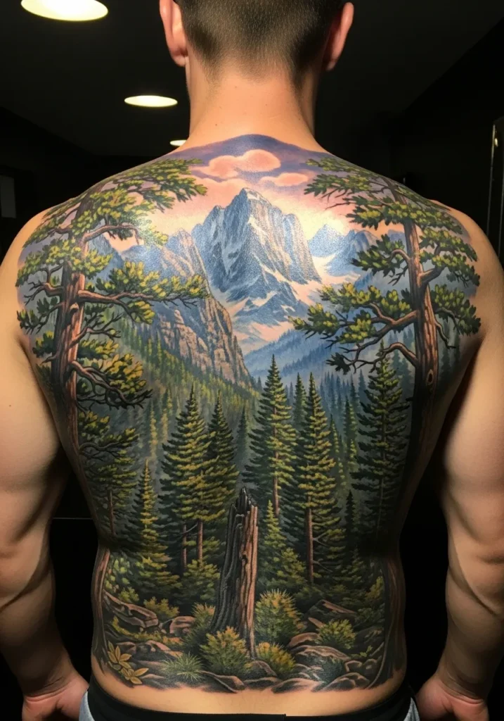 This breathtaking full-back tattoo captures a majestic mountain range surrounded by towering pine trees. The mix of cool blues and warm greens brings depth to the design, while the soft pink sunset sky adds a peaceful balance. The detailing in the trees and rocky slopes gives it a true-to-life feel, as if you’re looking at a painting etched into skin.