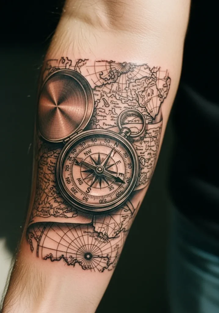 This stunning realism tattoo features a beautifully detailed compass resting over an old-world map. The metallic shading on the compass gives it a lifelike shine, while the fine lines of the map add an adventurous touch. The placement along the forearm makes the design flow naturally, creating a sense of journey and direction.