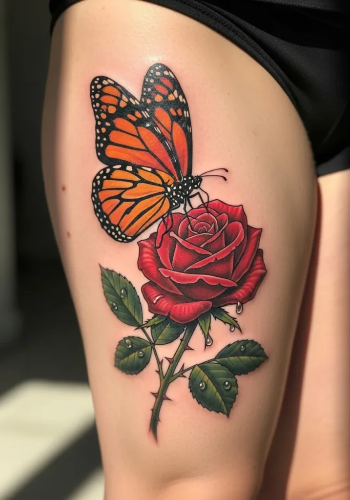 This colorful thigh tattoo showcases a bright orange butterfly perched delicately on a blooming red rose. The shading on the petals and the soft reflection on the butterfly wings make it look almost alive. The added dew drops on the leaves give it that perfect touch of realism.