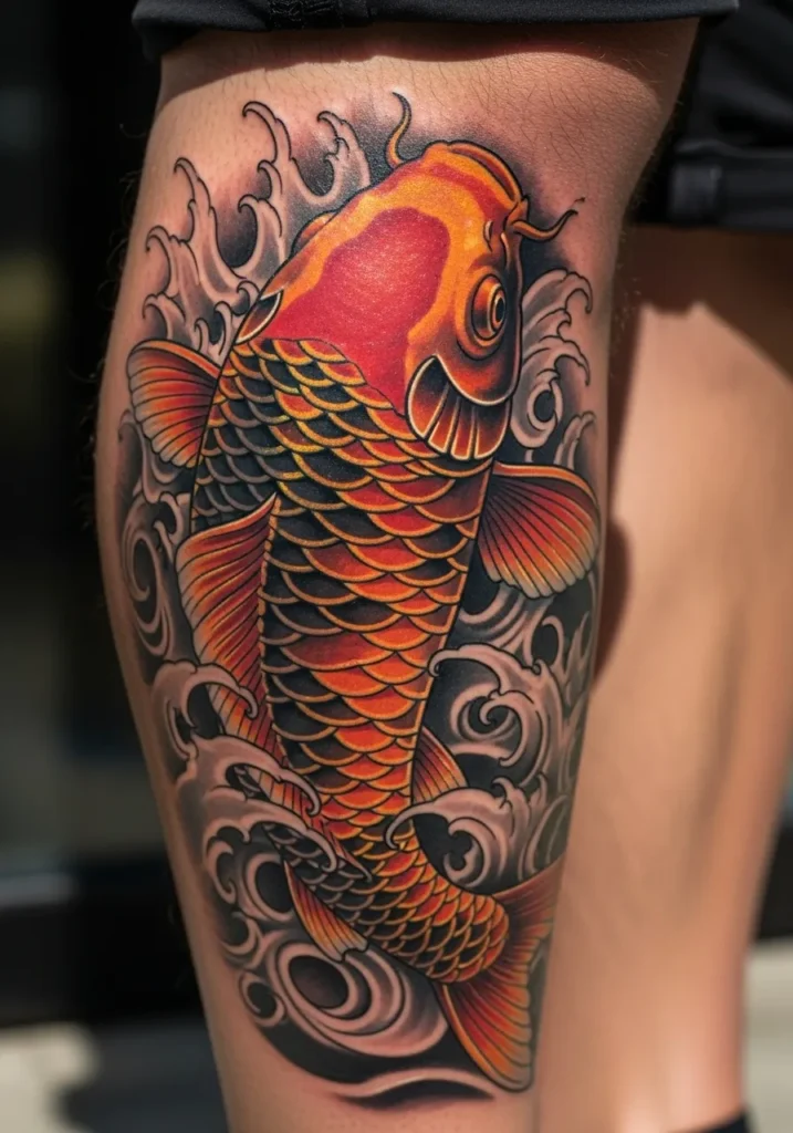 This bold thigh tattoo features a vibrant orange koi fish swimming through dark swirling water. The mix of bright orange, deep blacks, and soft highlights makes the design glow with energy. Every scale is meticulously detailed, giving the fish a lifelike shimmer.