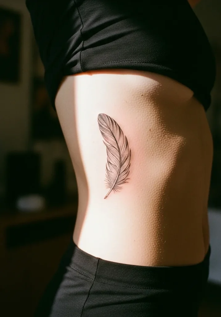 This elegant rib tattoo features a single feather done in fine-line realism. The soft shading gives it a light, airy feel, as though it’s gently floating on the skin. The placement along the side of the body complements the natural curves beautifully.