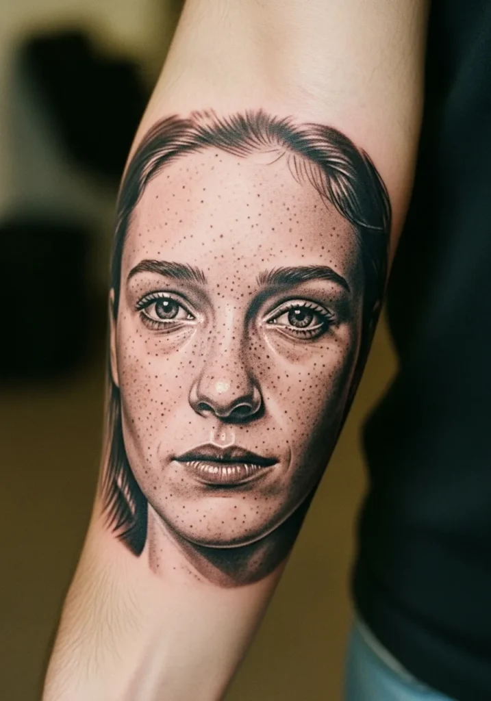 This tattoo captures an incredibly detailed portrait of a woman’s face, placed prominently on the forearm. Every freckle, hair strand, and shadow is rendered with stunning realism. The grayscale tones create a soft, natural look, and the depth around the eyes gives the piece an emotional intensity that feels almost photographic.
