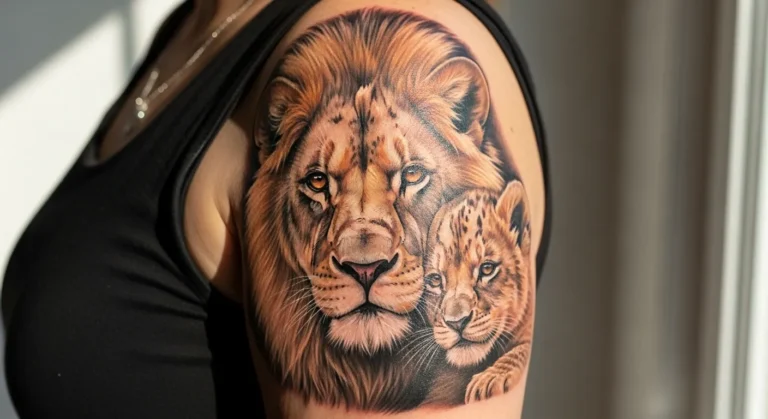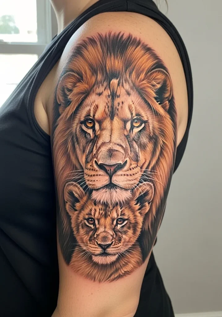 This heartwarming shoulder tattoo captures the faces of a lion and its cub with stunning lifelike detail. The golden fur, expressive eyes, and subtle shading give it incredible depth. The way the two faces rest together radiates warmth and love.
