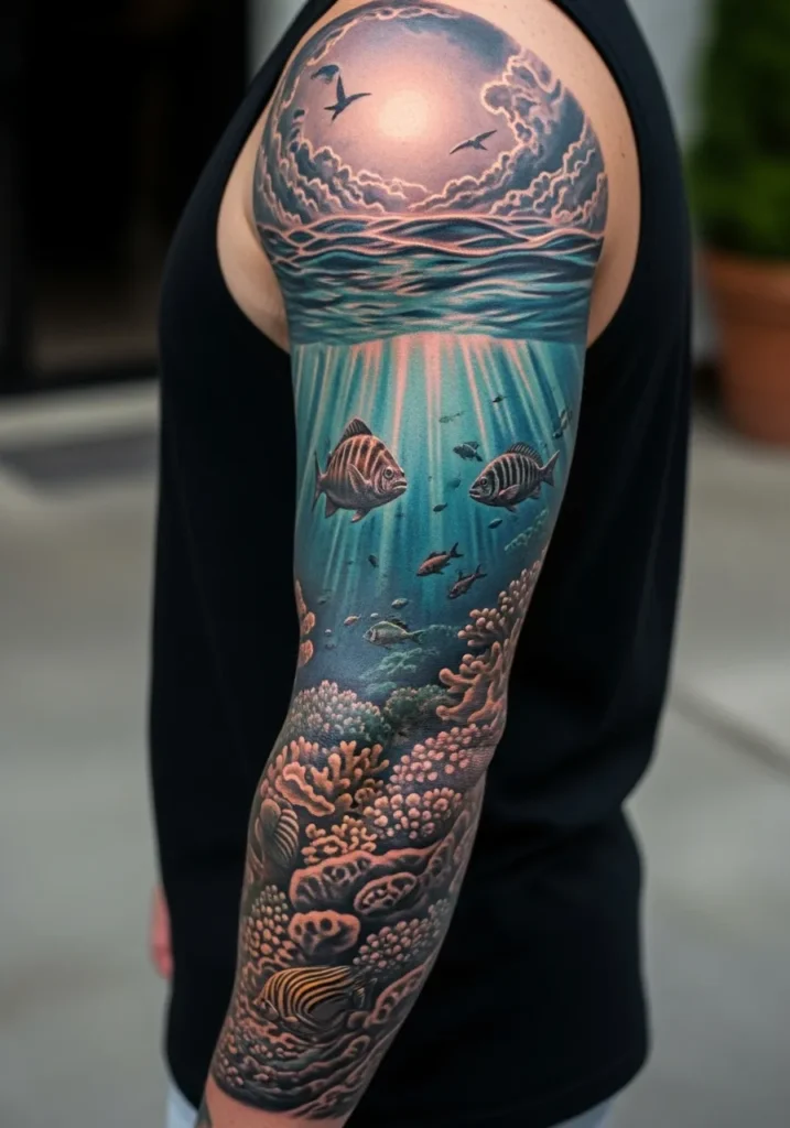 This full sleeve tattoo immerses the arm in a vivid underwater scene. The sunlight beams through the surface, illuminating fish and coral in a wash of blues and pinks. Every element, from the fish scales to the ripples of light, is rendered with breathtaking precision.