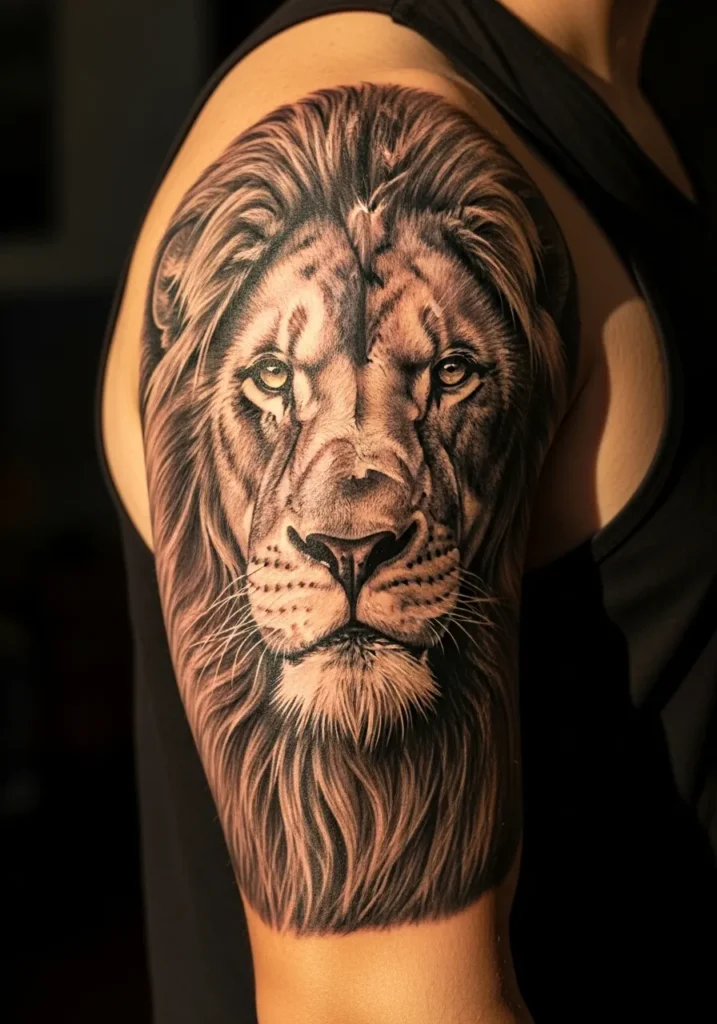 This powerful shoulder tattoo features a strikingly realistic lion rendered in flawless black and gray shading. The detail in the mane is incredible—each strand flows naturally, creating a sense of movement and depth. The golden highlights in the eyes give the piece life, making the lion’s gaze feel intense and commanding.