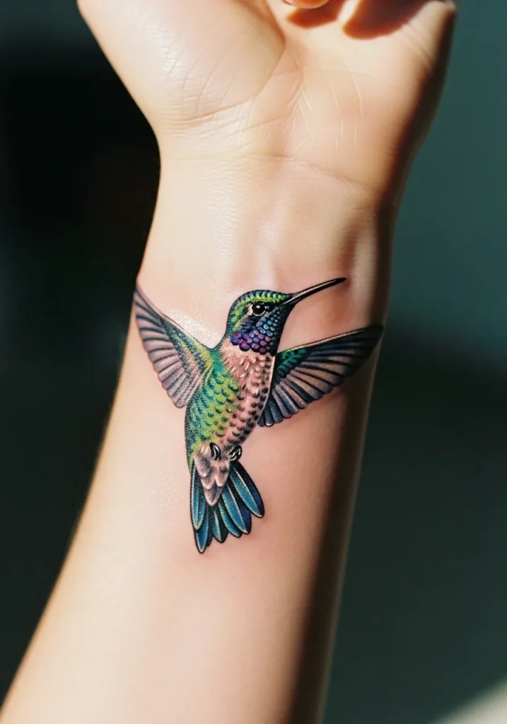 This delicate wrist tattoo showcases a beautifully detailed hummingbird mid-flight. The mix of greens, blues, and purples gives the feathers a shimmery, iridescent look that feels almost alive. The tattoo’s small size and soft edges make it a subtle yet vibrant addition to the skin.
