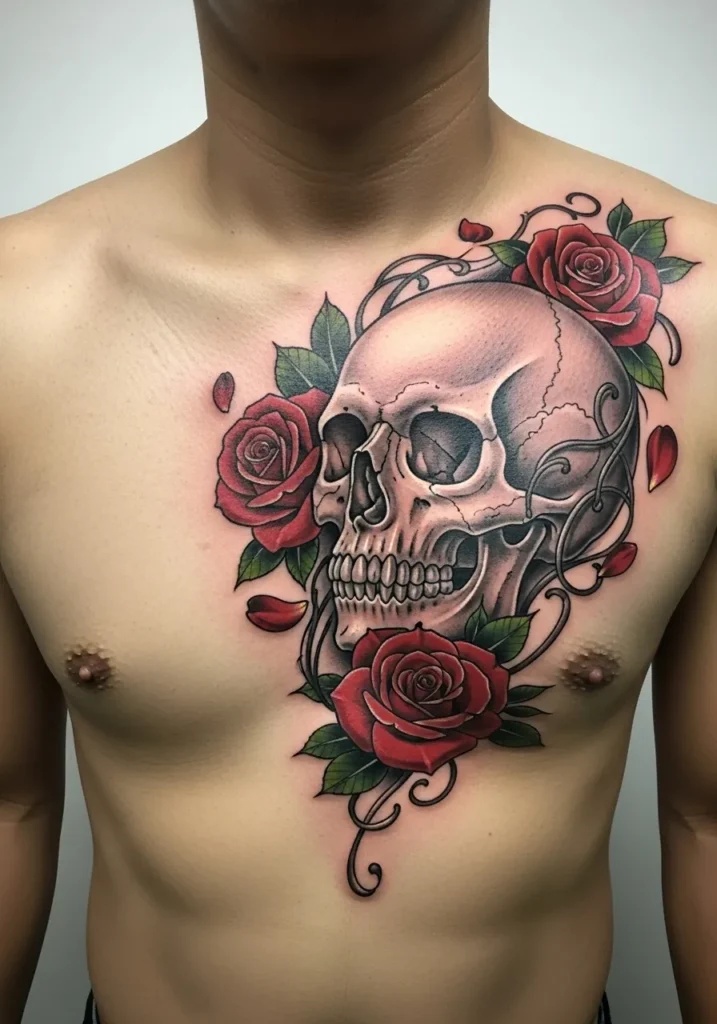 This chest piece blends dark realism with classic tattoo artistry. The detailed skull sits surrounded by vibrant red roses and green leaves, perfectly balanced across the chest. The shading adds depth and shadow, making the composition feel alive with contrast and flow.