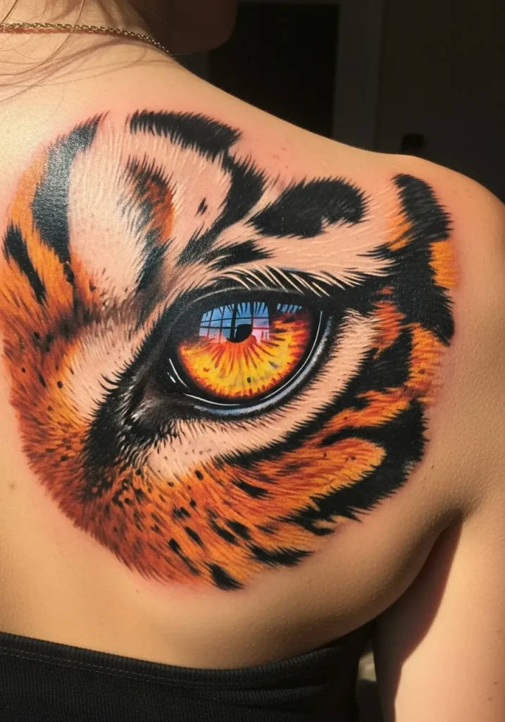 This stunning realism tattoo captures a tiger’s eye in incredible detail across the shoulder blade. The fiery orange and yellow tones make the eye glow with intensity, while the fine fur strokes around it add a lifelike texture. The reflection in the eye gives it a powerful, almost haunting realism.