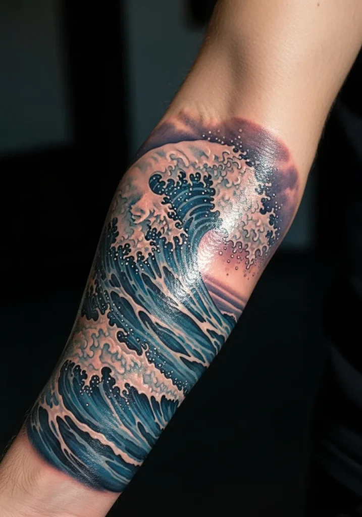 This tattoo showcases a breathtakingly realistic ocean wave wrapping around the forearm. The blend of deep navy blues and soft pink highlights gives it an almost fluid motion, while the intricate foam details make it feel alive. It’s a medium-sized piece that uses bold contrasts and gentle gradients to mimic the reflection of sunlight on water.