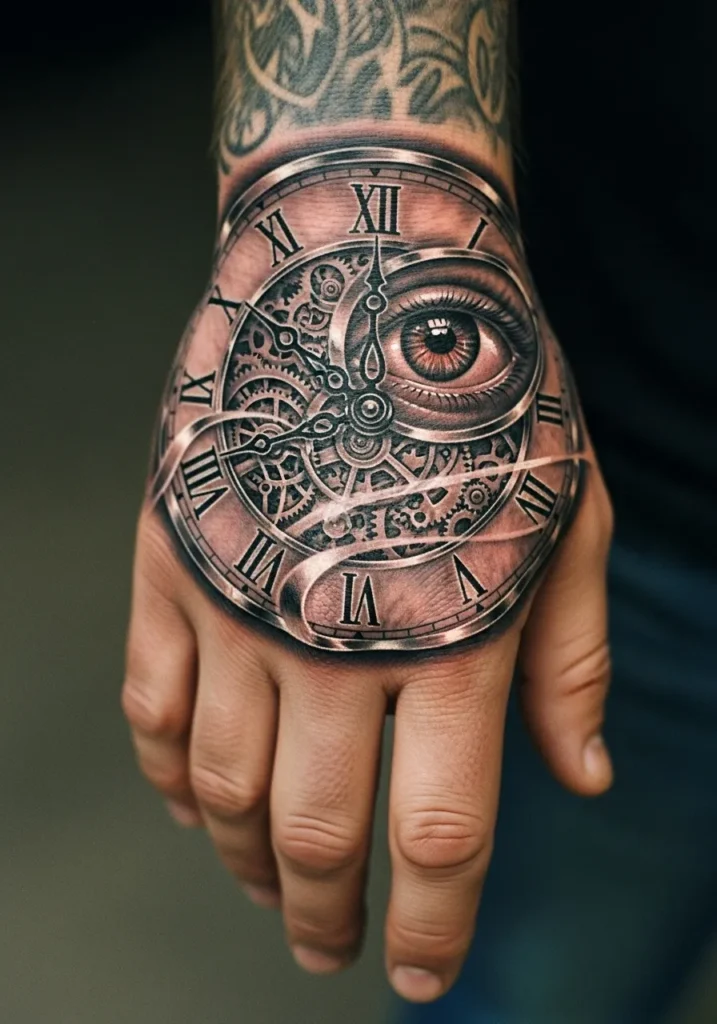 This incredible hand tattoo combines a detailed clock face with an all-seeing eye at its center. The gears, Roman numerals, and fine metallic shading make it look like real machinery beneath the skin. The eye is so lifelike it almost feels like it’s watching, adding an intriguing touch of symbolism about time and awareness.