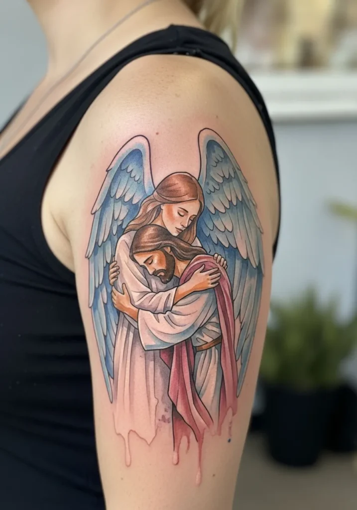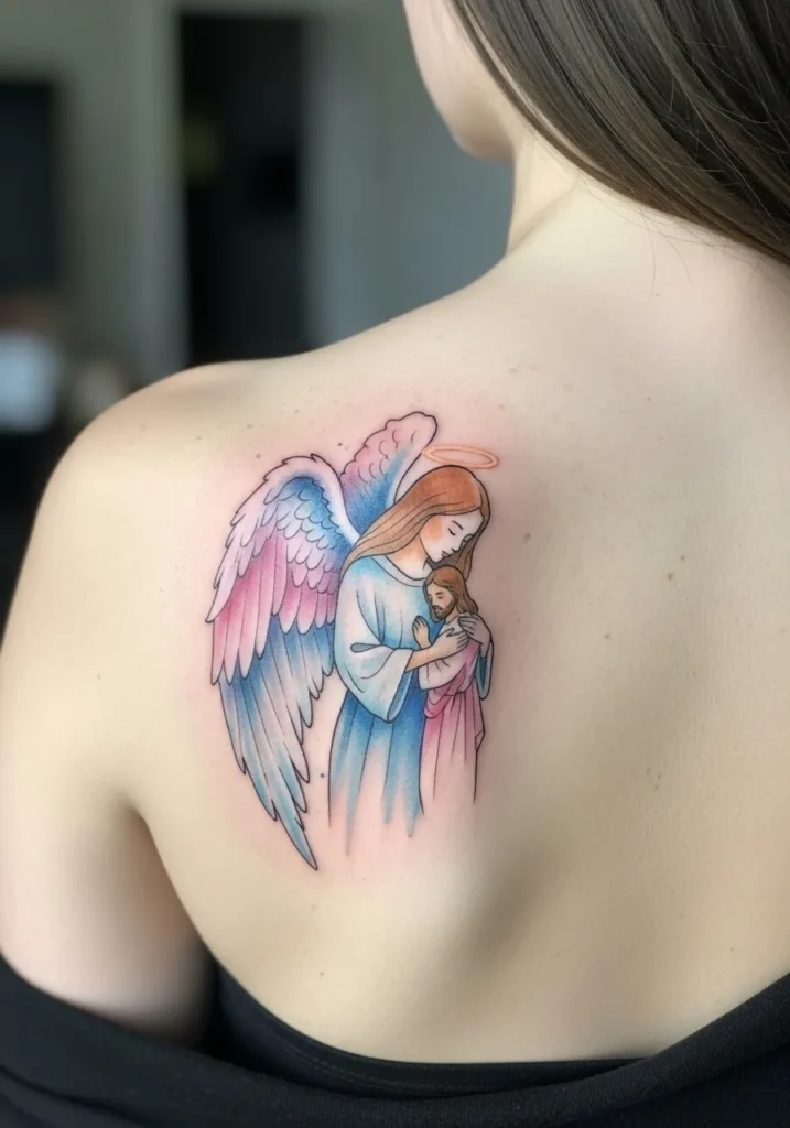 This tattoo is placed on the upper back and shows a softly colored angel holding Jesus in a tender embrace. The style leans toward watercolor realism, with flowing wings in pastel blues and pinks and warm skin tones that feel calm and soothing. The size is medium, giving enough space for detail while keeping the overall look gentle and balanced.