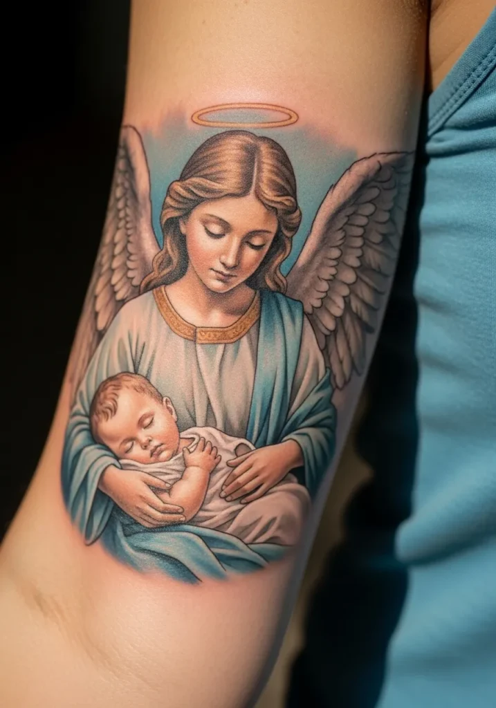 Placed on the side of the torso, this tattoo shows an angel gently cradling a child in her arms. The style is realistic with soft color blending, using warm neutrals and calming blues. The medium size allows the details in the faces and wings to shine.