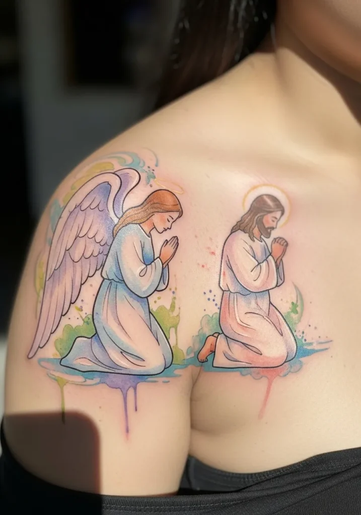This tattoo sits on the shoulder and features an angel and Jesus kneeling together in prayer. The style blends illustration and watercolor, with pastel tones and gentle outlines that keep it light and symbolic. The size stays medium, fitting the shoulder beautifully.