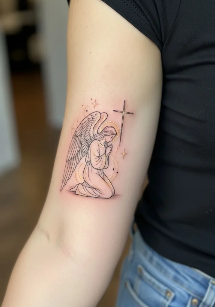 This small tattoo is placed on the forearm and shows a delicate angel holding a cross. The lines are fine and clean, with soft color accents that keep the look gentle. The size makes it subtle and personal.