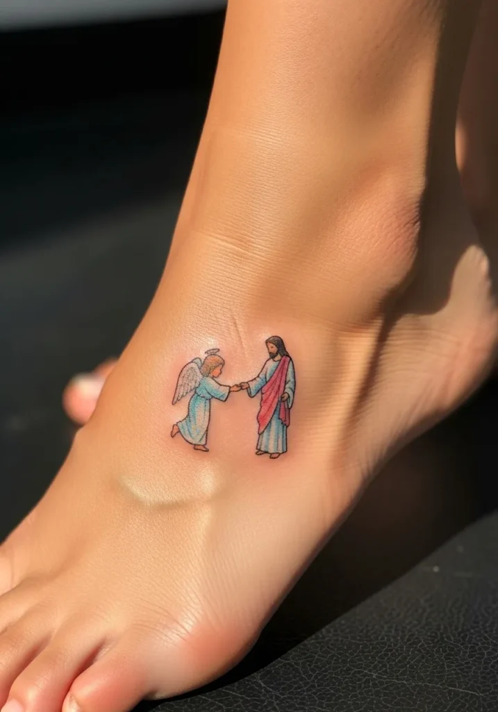 Placed on the top of the foot, this small tattoo shows tiny figures of an angel and Jesus standing together. The colors are soft and pastel, with minimal shading that keeps it playful and symbolic. The placement makes it feel almost hidden.