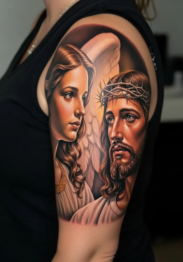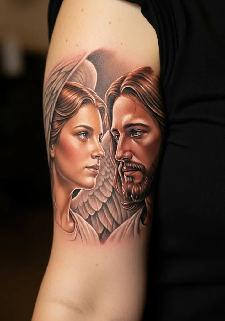 This medium to large tattoo sits on the upper arm and features a detailed portrait of an angel beside Jesus. The style is realistic, with rich color tones and expressive faces. The shading adds depth and emotion without feeling heavy.