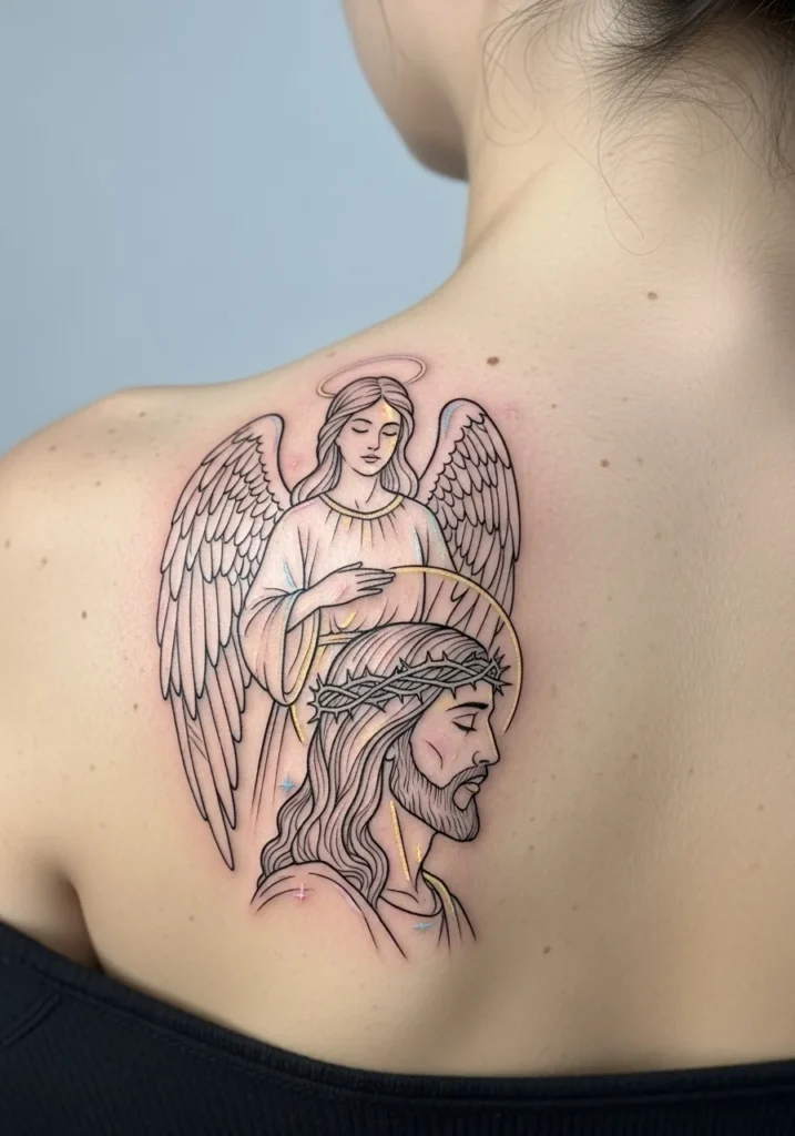This tattoo is placed on the upper back and shows an angel watching over Jesus from behind. The style is illustrative with soft shading and warm neutral colors. The size gives the design presence while keeping it graceful.