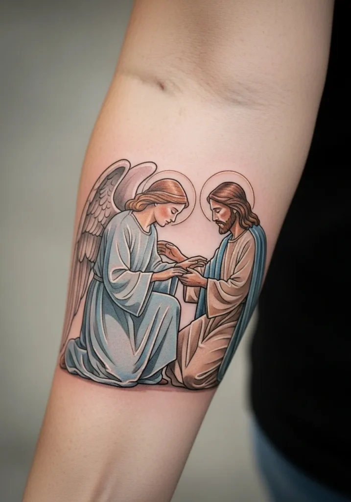 This medium sized tattoo is placed on the forearm and shows an angel and Jesus kneeling together in prayer. The style is softly realistic, with gentle shading and warm earthy tones mixed with light blues. The figures are clear and expressive without feeling heavy.