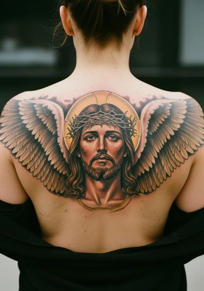 This large tattoo stretches across the upper back and features Jesus with expansive angel wings framing his face. The style is bold realism with strong color contrast, using warm skin tones and softly shaded wings that feel protective and strong. The size makes it a true statement piece.
