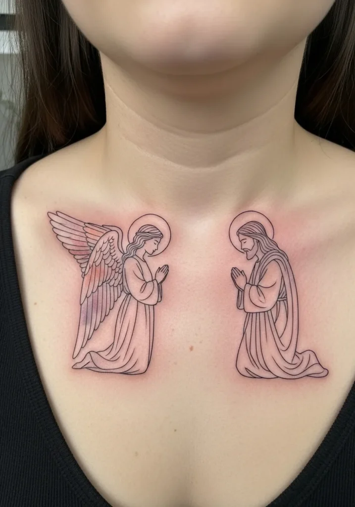 This tattoo is placed on the upper chest and features two softly colored angels facing inward. The style is illustrative with pastel tones and fine outlines that keep the look light and symbolic. The size is medium, sitting symmetrically and drawing the eye naturally.