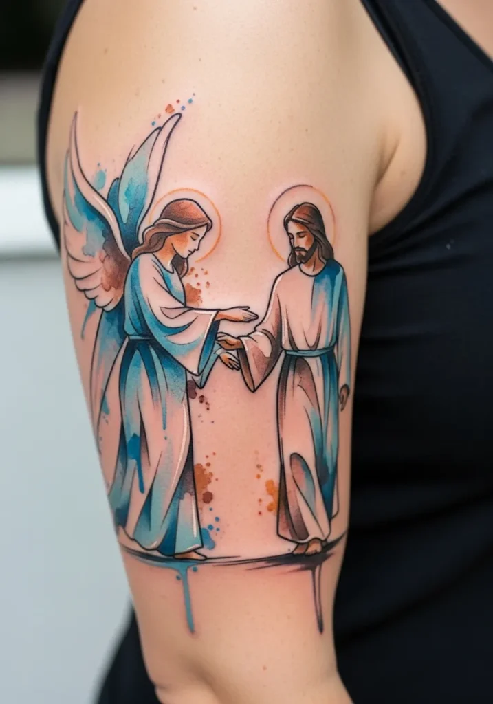 This medium sized tattoo sits on the upper arm and shows an angel gently guiding Jesus forward. The style combines soft realism with watercolor touches, using blues, creams, and warm neutrals. The movement in the design makes it feel alive and emotional.