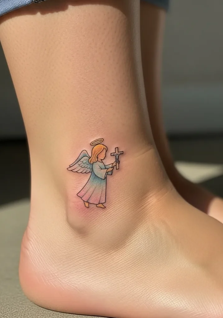 This small tattoo is placed on the ankle and features a tiny angel holding a cross with soft pastel coloring. The lines are delicate, and the size keeps it subtle and sweet. The placement makes it feel light and almost hidden.