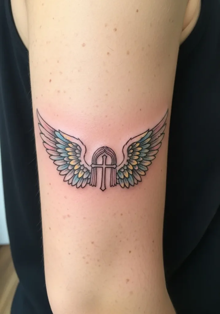 This tattoo is placed on the upper arm and features a pair of softly colored angel wings framing a simple cross at the center. The style leans toward clean illustration with gentle shading, using muted blues, soft grays, and warm highlights. The size is small to medium, keeping the design symbolic and easy to wear.