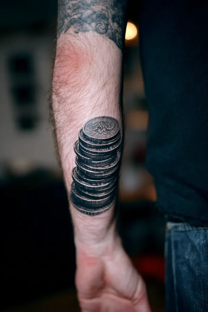 Placed along the inner forearm, this striking black and grey tattoo features a tall stack of finely detailed coins balanced one on top of another. Each coin is shaded with realistic highlights and shadows, giving the design a bold three dimensional look. The vertical placement elongates the arm and makes the piece feel intentional and strong while still remaining clean and minimal.