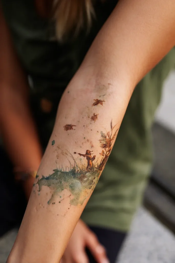 This soft and artistic forearm tattoo shows tiny seeds drifting upward and transforming into delicate birds in flight. The design blends fine line details with soft watercolor style splashes in muted greens and earthy tones. The composition feels light and airy, almost like the movement is frozen mid breeze across the skin.