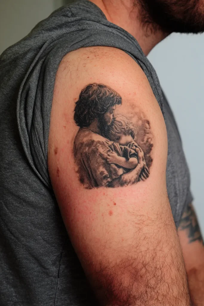 This upper arm tattoo features a beautifully shaded black and grey portrait of a shepherd tenderly holding a lamb. The circular composition gives it a framed, almost medallion like appearance. Fine shading defines the folds of fabric, the texture of the wool, and the gentle expression on the shepherd’s face, creating a deeply emotional and intimate scene.