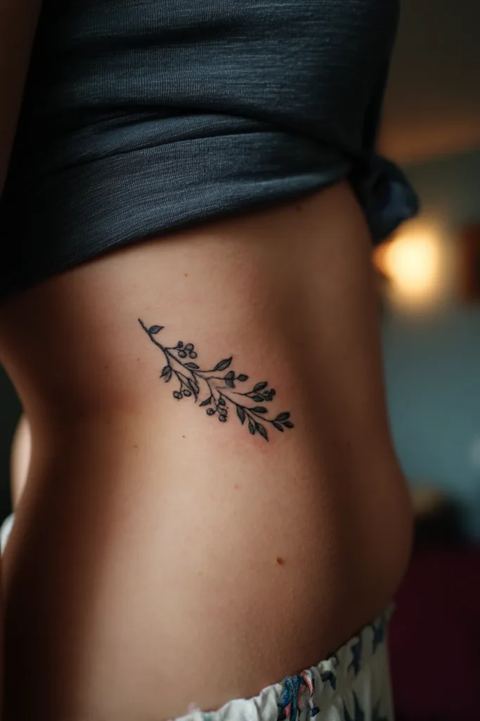 This delicate fine line tattoo sits softly along the side of the ribcage, featuring a slim olive branch with tiny leaves flowing in a gentle curve. The design is small and minimal, done in crisp black ink with subtle line weight variation that gives the leaves quiet depth. Its placement follows the natural shape of the waist, making it feel elegant and almost like it was meant to live there all along.