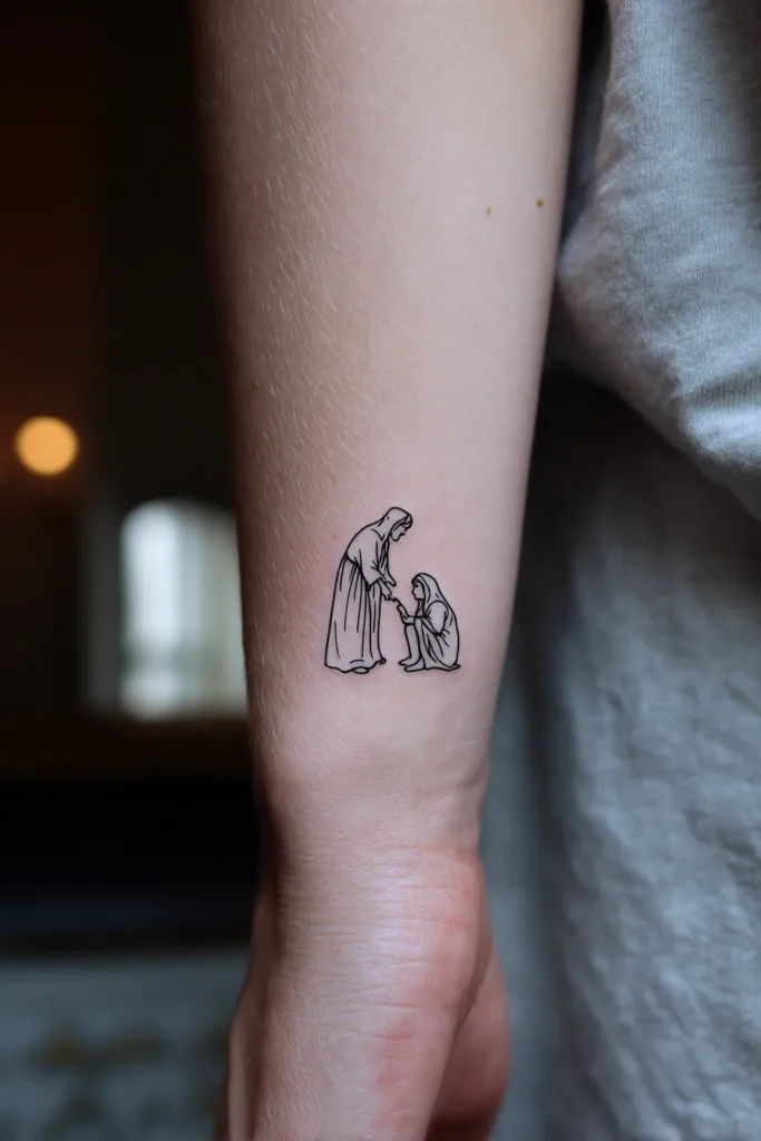 This tiny black ink tattoo on the inner forearm shows two small figures, one standing and one kneeling, in a clean line art style that feels almost storybook inspired. The design is compact and minimal, with fine outlines and just enough detail to suggest robes and posture without heavy shading. Its size keeps it subtle, making it perfect for someone who loves meaningful tattoos that are not overly bold.