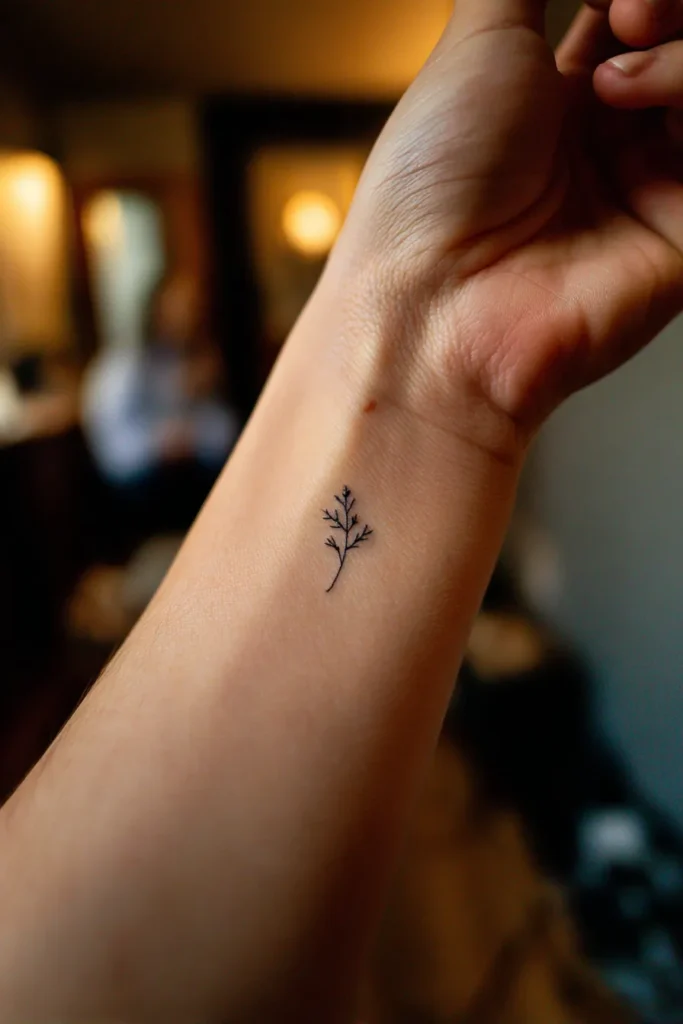 This delicate fine line tattoo rests softly on the inner wrist, featuring a slender branch with tiny sprouting leaves drawn in crisp black ink. The design is small and airy, with thin, graceful lines that give it an almost whisper like presence on the skin. Its placement near the pulse point makes it feel intimate and subtle, perfect for someone who loves understated yet meaningful ink.