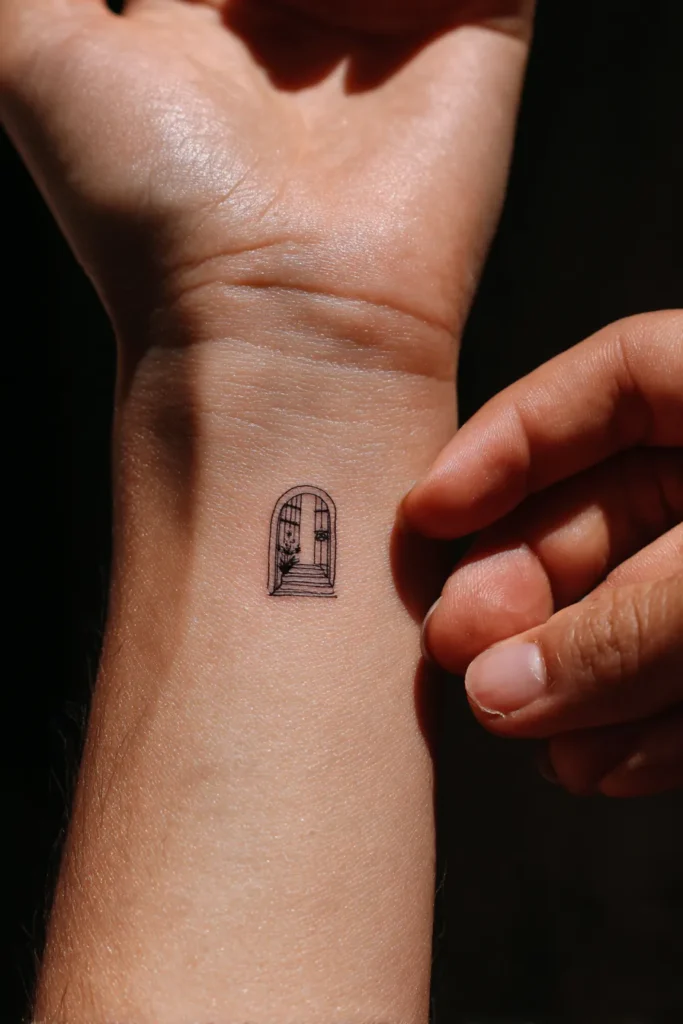 This tiny fine line tattoo sits delicately on the inner wrist, featuring a small arched doorway with subtle steps leading up and faint vertical planks drawn in crisp black ink. The design is minimal and almost storybook like, with soft shading that gives the door depth without overpowering the skin. Its petite size makes it feel intimate and personal, like a secret only you know about.