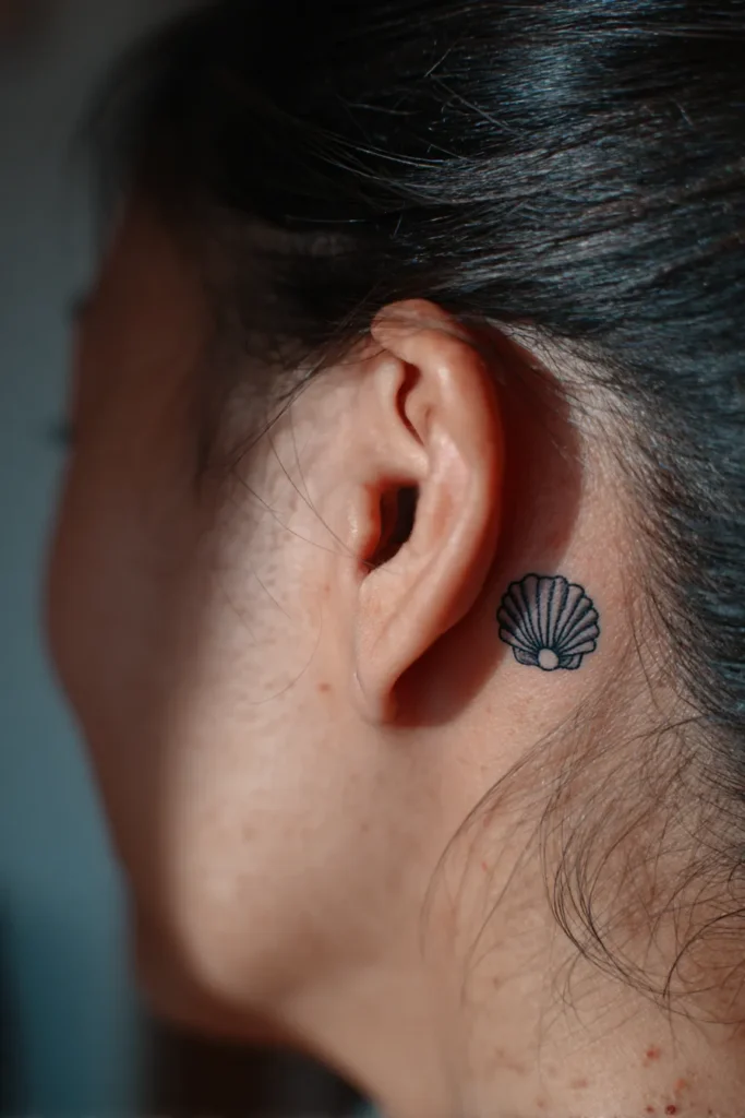 This delicate tattoo sits just behind the ear, featuring a small scallop shell outlined in crisp black ink with fine inner lines that add texture and dimension. The design is minimal and dainty, perfectly sized to tuck into that subtle space where it peeks out when hair is pulled back. Its clean linework keeps it elegant and timeless without needing any color.