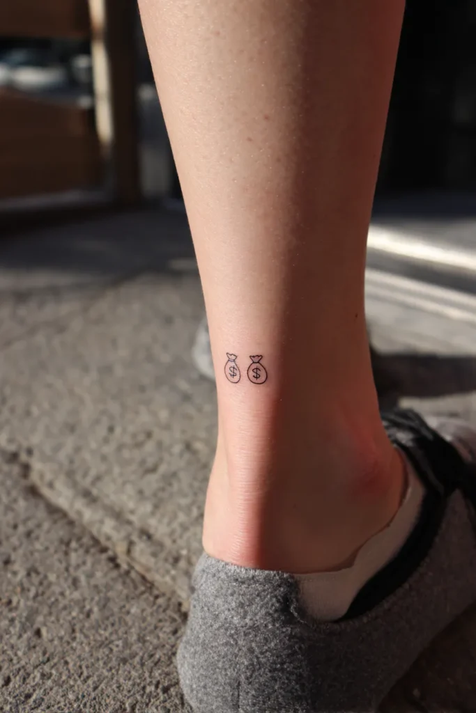This ankle tattoo features two tiny money bags outlined in fine black ink, each marked with a small dollar symbol at the center. The lines are clean and minimal, and the size is dainty enough to feel playful while still carrying intention. Placed just above the heel, it is easy to hide or show off depending on your mood and shoes.