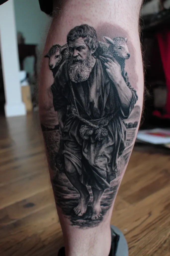 There is something so moving about this image that I cannot help but feel comforted when I look at it. The Parable of the Lost Sheep has always felt personal to me, and this design captures that protective love in such a powerful way. It feels like a reminder that no one is forgotten or left behind. For anyone who craves a tattoo that radiates warmth and reassurance, this one feels incredibly meaningful.