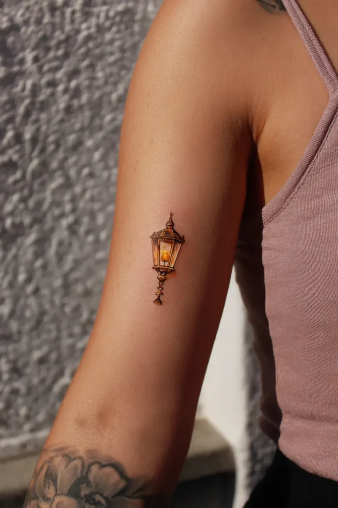 This upper arm tattoo showcases a beautifully detailed vintage lantern with warm golden tones glowing from within. The black outlines are crisp while the soft amber shading inside creates a realistic light effect that almost looks illuminated. Its medium size allows for intricate detailing without feeling too bold.