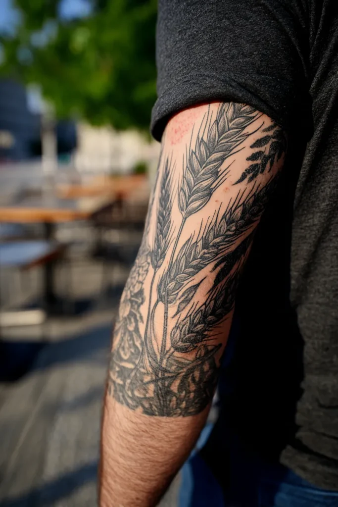 This bold forearm piece features detailed stalks of wheat flowing vertically along the arm, inked in rich black and soft grey shading. The fine line work captures every grain and leaf with striking realism, while darker foliage near the base adds depth and contrast. Its larger scale allows the design to wrap naturally with the shape of the arm, creating movement that feels organic and strong.