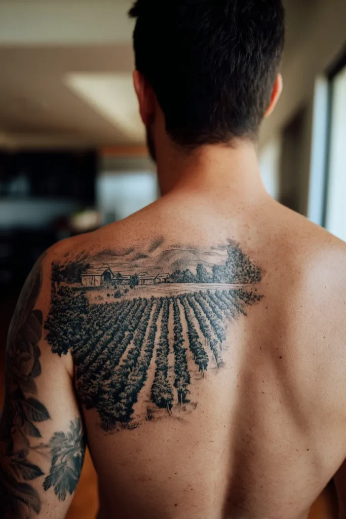 Spanning across the upper back, this large black and grey tattoo portrays a sower scattering seeds across a wide field, with detailed crops stretching outward like wings. The landscape is rich with texture, from rows of plants to distant hills, creating a bold yet balanced composition that follows the natural curve of the shoulders.